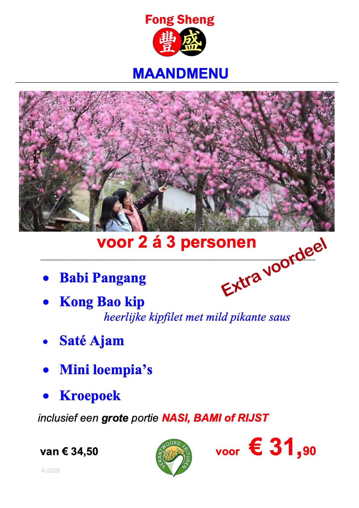 * i.p.v. rijst: nasi of bami € 1,30 extra,